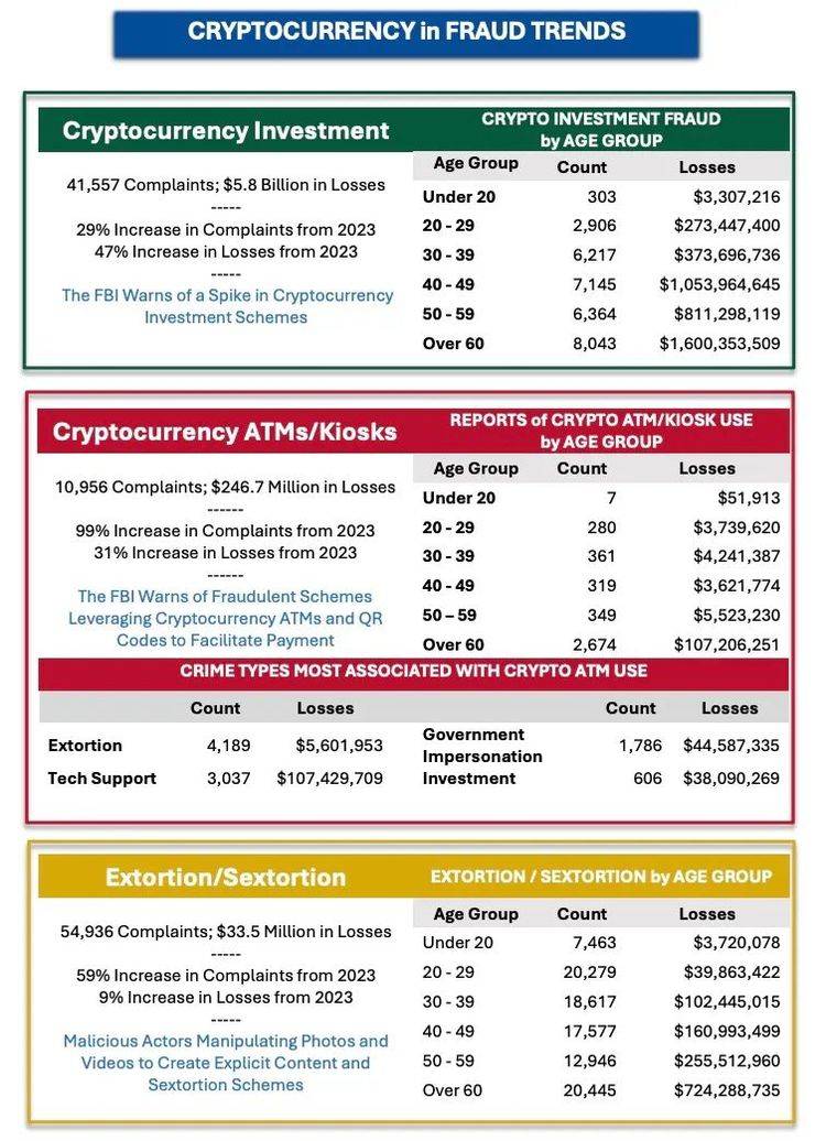 FBI 发布的《2024 年加密货币欺诈报告》揭示了当前加密资产环境下网络犯罪的新趋势:加密货币相关案件大幅增加,60 岁以上的老年群体成为主要受害者;诈骗手法高度专业化和国际化,同时,加密货币已成为犯罪分子洗钱和转移资金的首选工具。