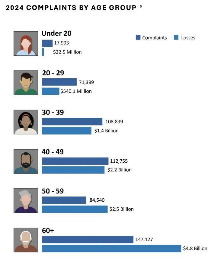 这一群体提交了 147,127 起投诉,报告损失 48.85 亿美元。投诉量同比增长 46%,损失额同比增长 43%。其中 7,500 人报告损失超过 10 万美元,平均损失高达 8.3 万美元。