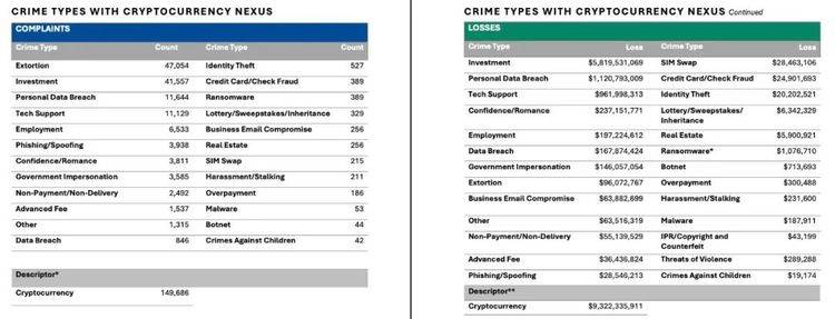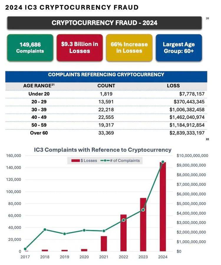 加密货币相关投诉达 149,686 起,造成 93 亿美元损失,损失金额同比增长 66%。受害者中,60 岁以上群体占比最高。