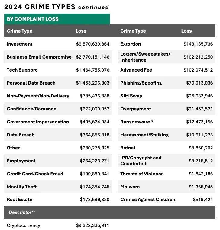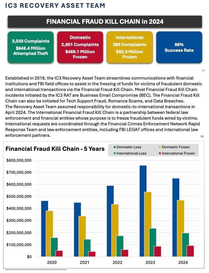 2024 年,IC3 收到 333,981 起网络诈骗投诉,造成 137 亿美元损失,占全年总损失的 83%。主要交易方式包括加密货币、电汇、信用卡支付等。