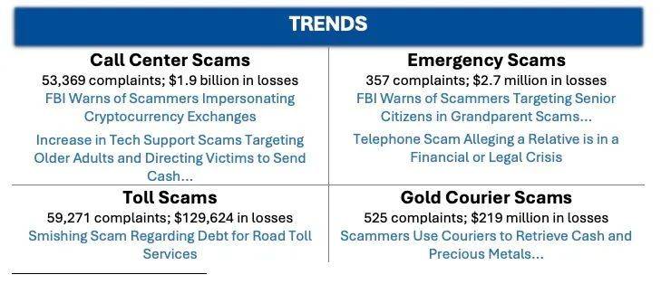 呼叫中心诈骗:53,369 起,损失 19 亿美元。 紧急诈骗(冒充亲属求助):357 起,损失 270 万美元。 收费公路诈骗(短信钓鱼):59,271 起,损失 12.9 万美元。 黄金快递诈骗:525 起,损失 2.19 亿美元。